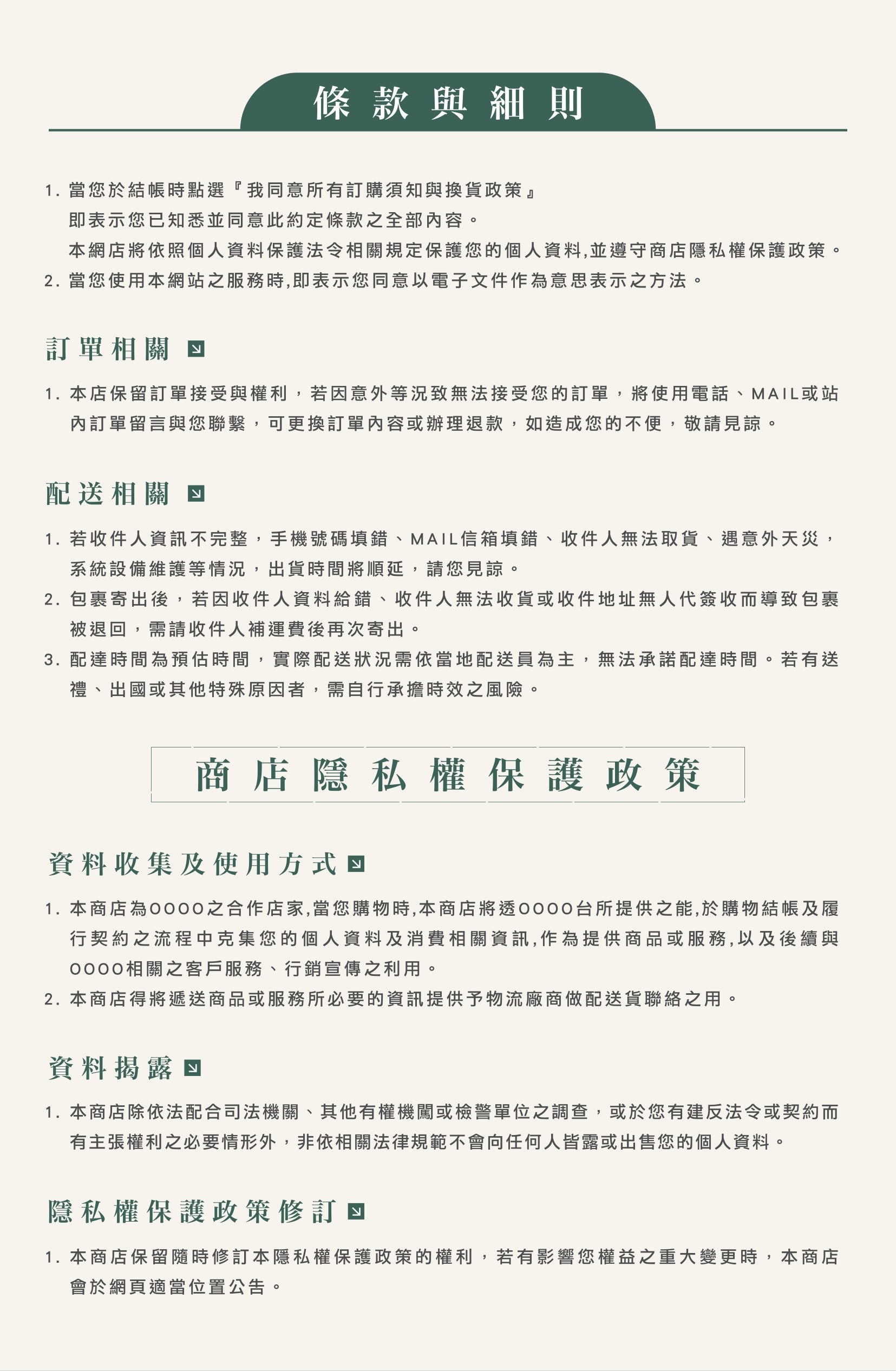 1.當您於結帳時點選我同意所有訂購須知與換貨政策即表示您已知悉並同意此約定條款之全部內容。本網店將依照個人資料保護法令相關規定保護您的個人資料,並遵守商店隱私權保護政策。